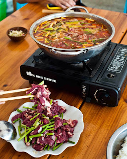 The heat from the soup base was amplified by then dipping each piece of meat into a mixture of dried and fresh chill mixed with salt, until none of us could speak and sweat literally dripped from our brows. But still we kept eating.